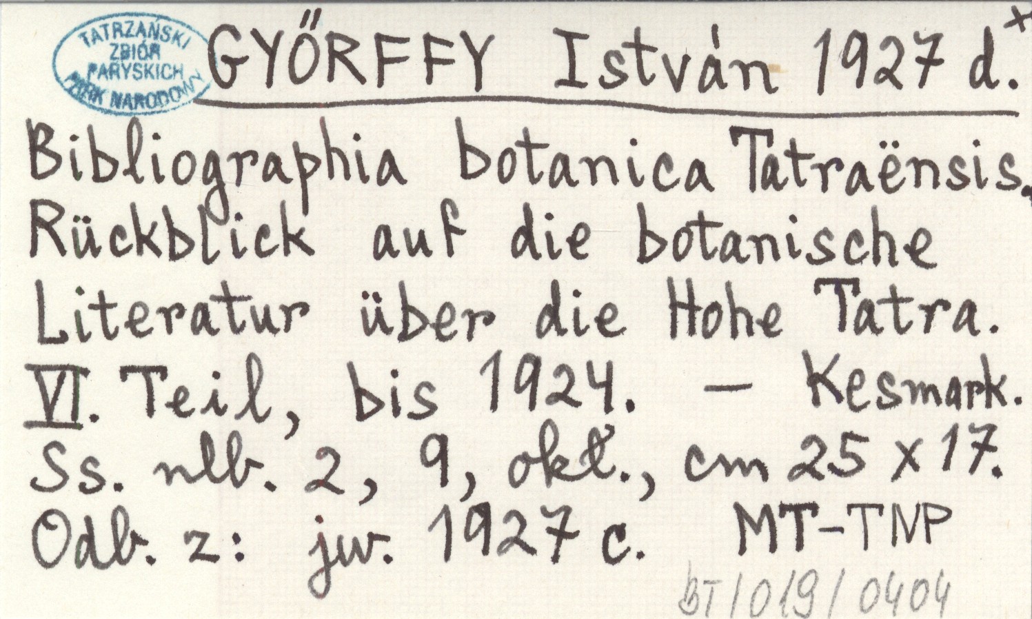 GYŐRFFY István 1927 d Bibliographia botanica Tatraënsis. Rückblick auf die botanische Literatur über die Hohe Tatra. VI. Teil, bis 1924.