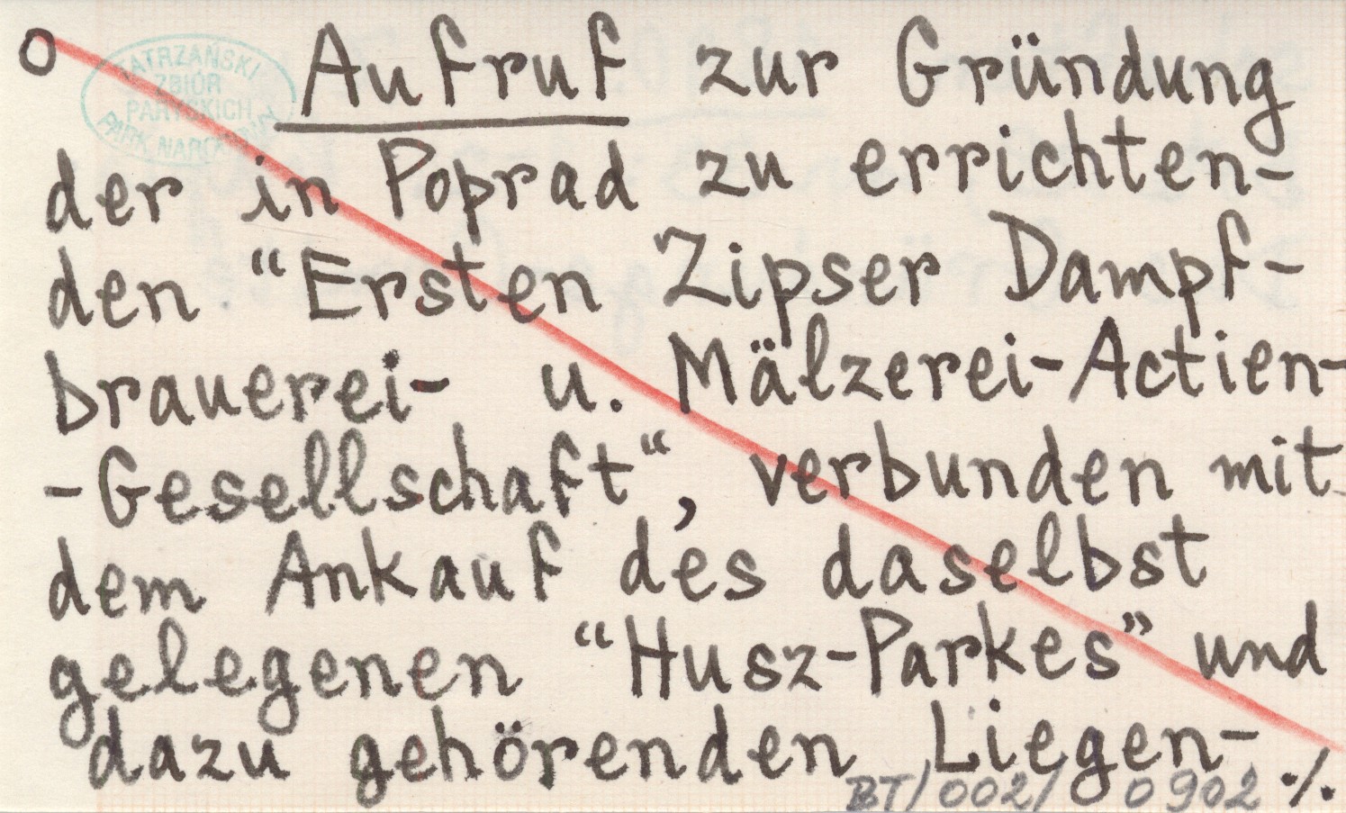 Aufruf zur Gründung der in Poprad zu errichtenden "Ersten Zipser Dampfbrauerei- u. Mälzerei-Actien-Gesellschaft", verbunden mit dem Ankauf des daselbst gelegenen "Husz-Parkes" und dazu gehörenden Liegenschaften. 1890