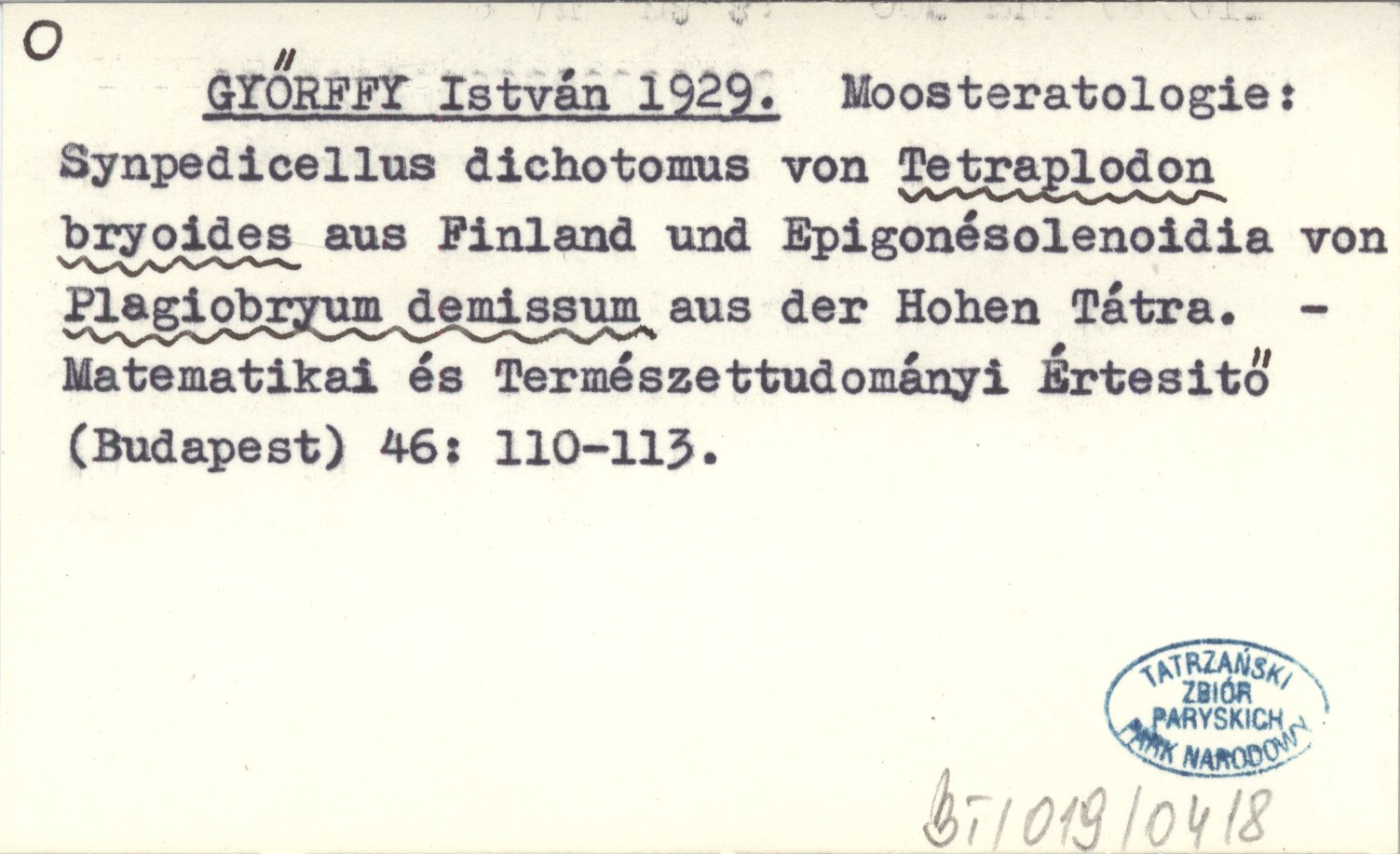GYÕRFFY István 1929 Moosteratologie: Synpedicellus dichotomus von Tetraplodon bryoides aus Finland und Epigonésolenoidia von Plagiobryum demissum aus der Hohen Tátra.