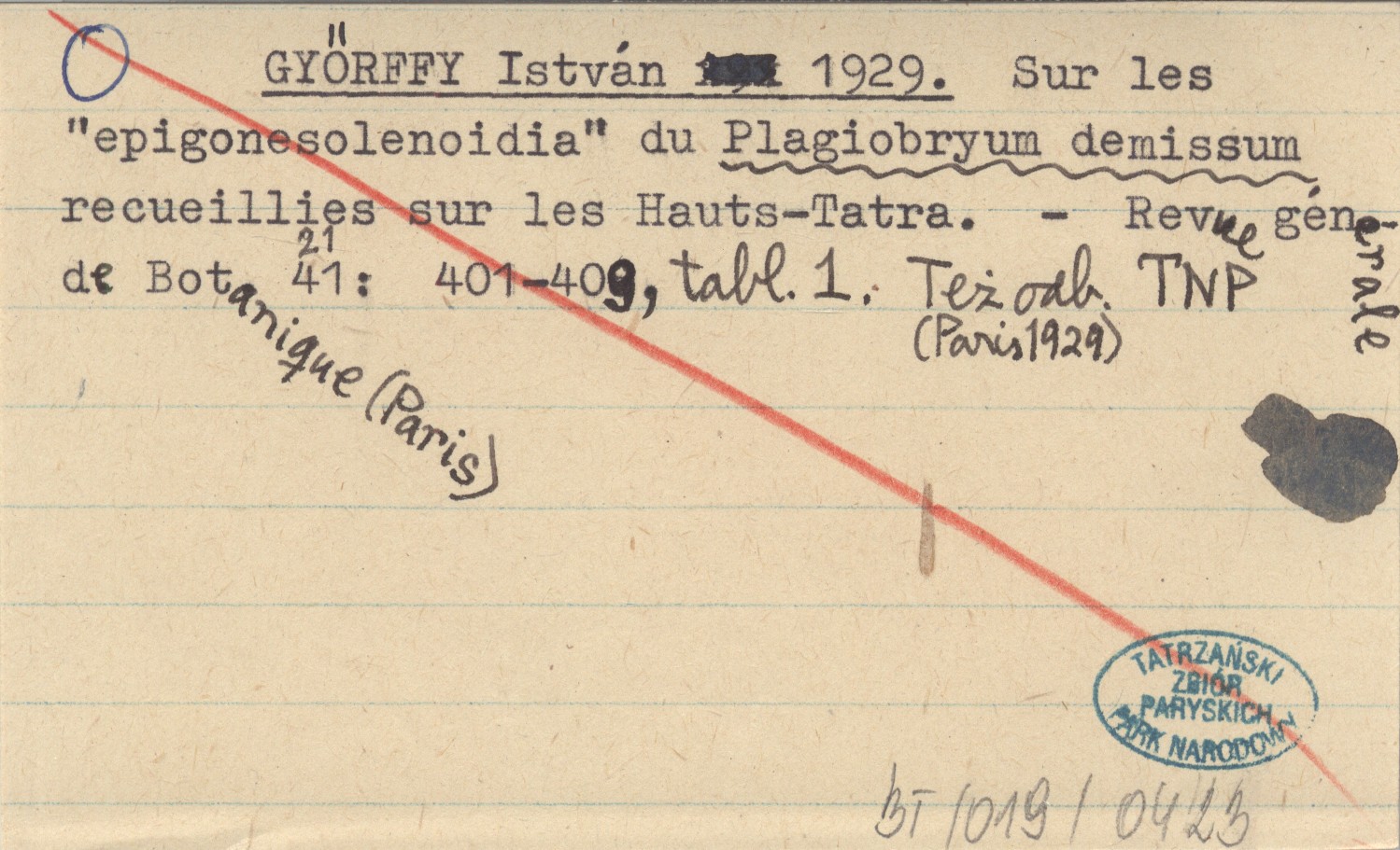 GYŐRFFY István 1929 Sur les "epigonesolenoidia" du Plagiobryum demissum recueillies sur les Hauts-Tatra.