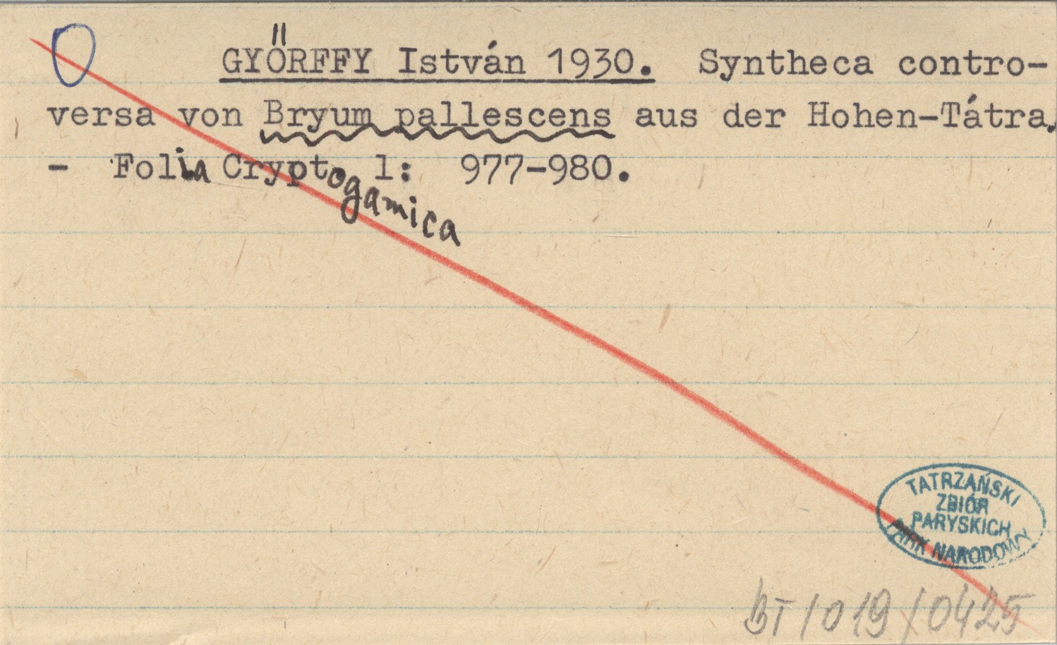 GYŐRFFY István 1930 Syntheca controversa von Bryum pallescens aus der Hohen-Tátra.