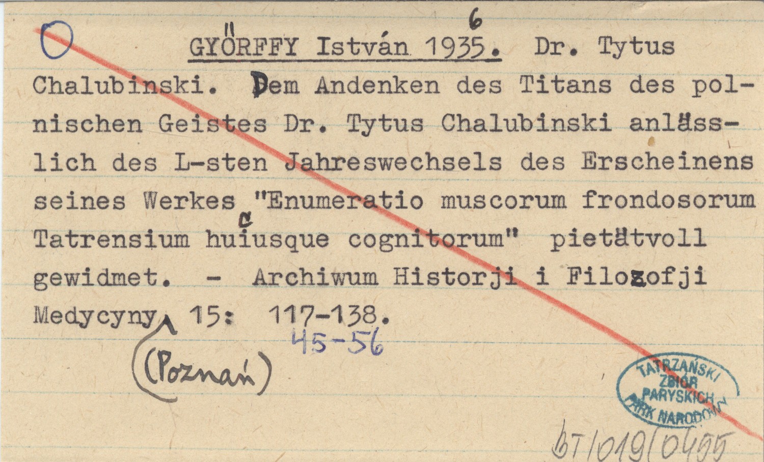 GYŐRFFY István 1935-1936 Dr. Tytus Chalubiski. Dem Andenken des Titans des polnischen Geistes Dr. Tytus Chalubinski anlässlich des L-sten Jahreswechsels des Erscheinens seines Werkes "Enumeratio muscorum frondosorum Tatrensium hui(c)usque cognitorum" pietätvoll gewidmet.