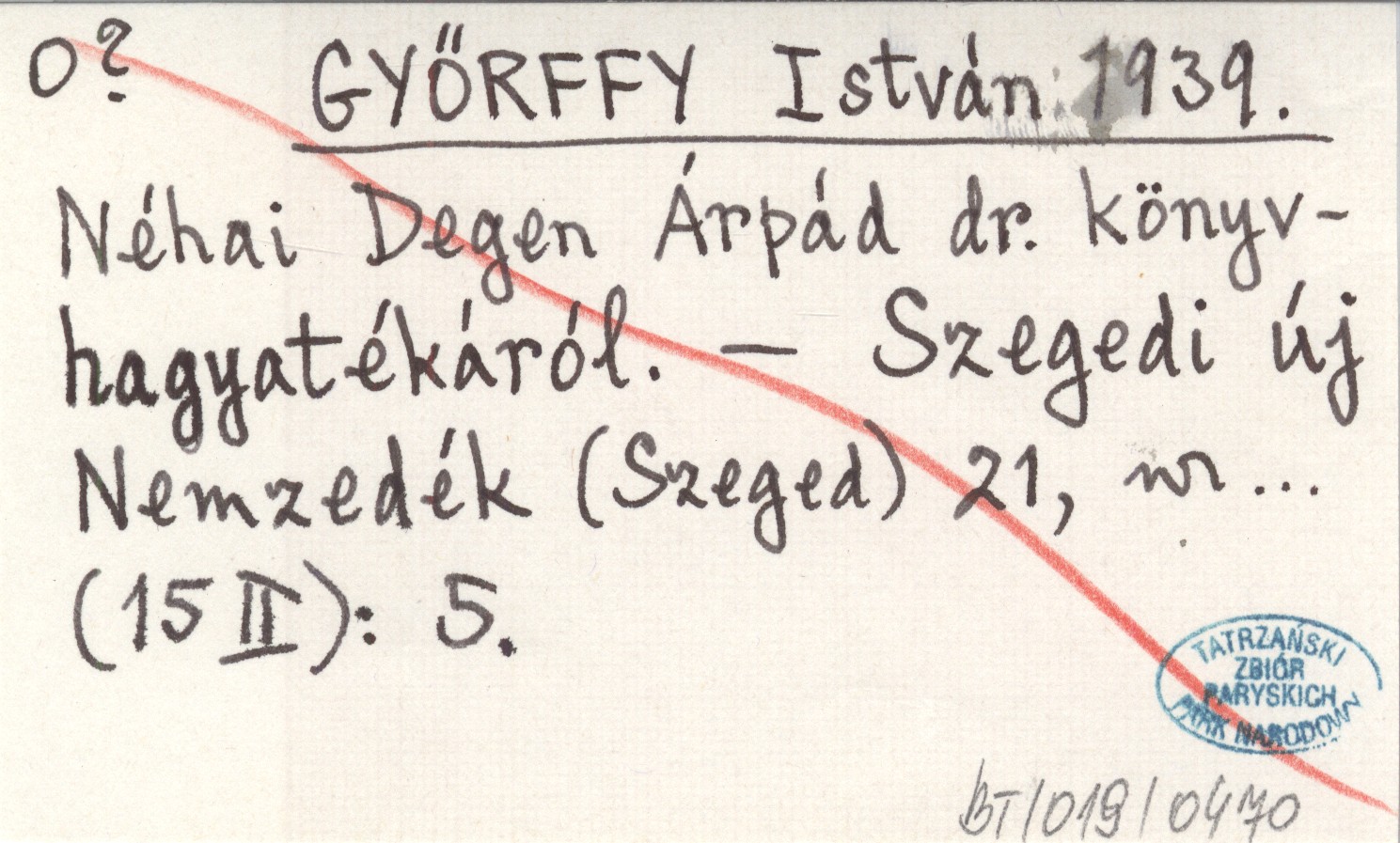 GYŐRFFY István 1939 Néhai Degen Árpád dr. könyvhagyatékáról.