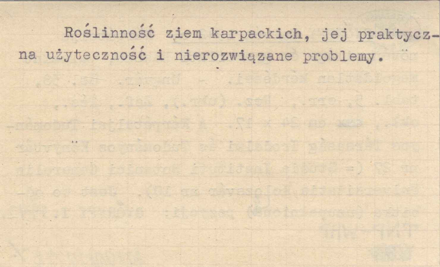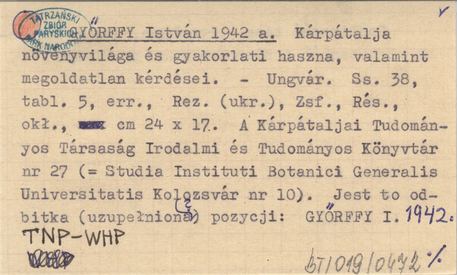 Ungvár (A Kárpátátaljai Tudományos Társaság Irodalmi és Tudományos Könyvtár; 27) , 38 s., 5 k., err., Rez. (ukr.), Zsf., Rés., okł., 24x17 cm. Ro¶linno¶ć ziem karpackich, jej praktyczna użyteczno¶ć i nierozwi±zane problemy. (=Studia Instituti Botanici Generalis Universitatis Kolozsvár nr 10). Jest to odbitka (uzupełniona?) pozycju: GYŐRFFY I. 1942.