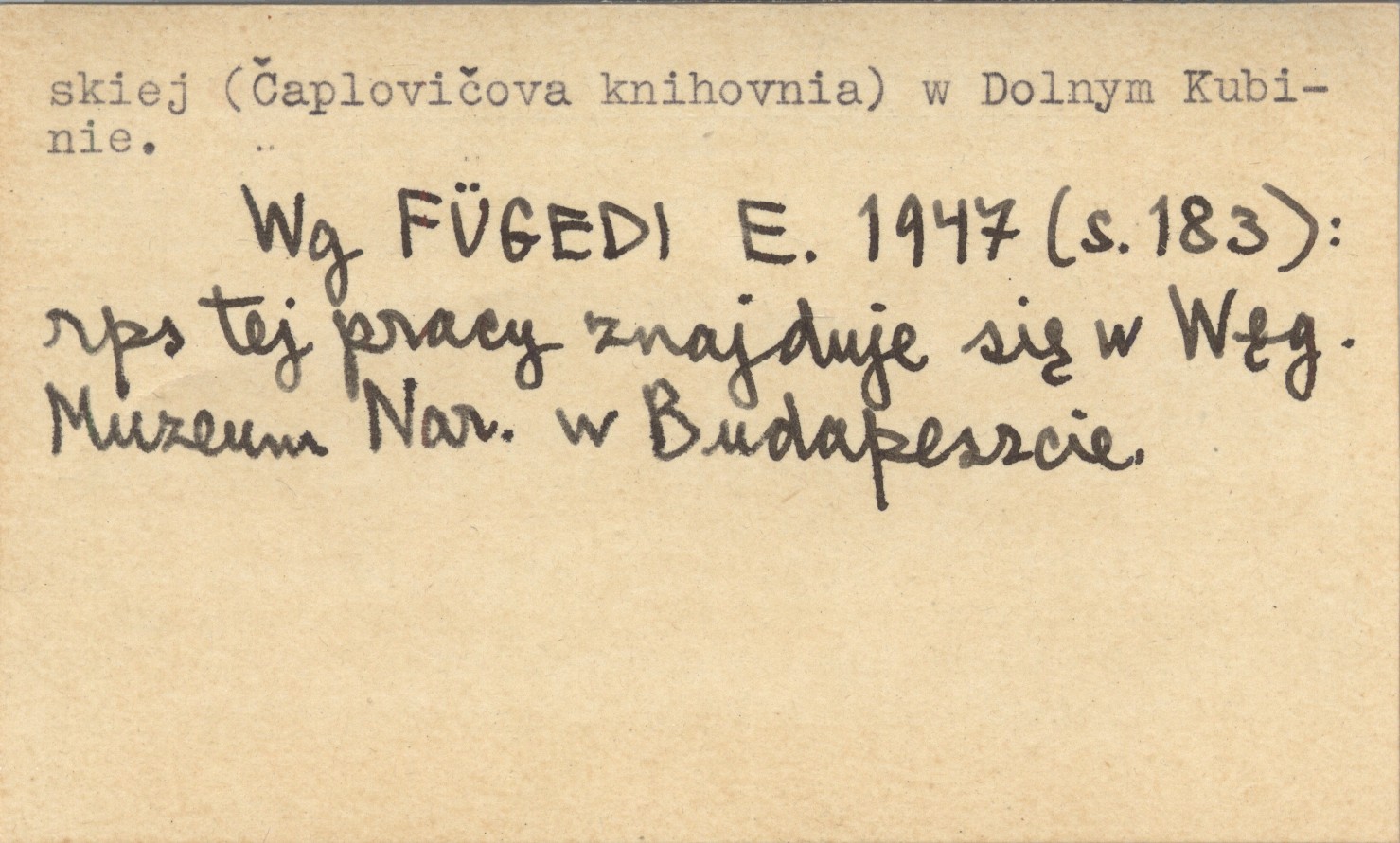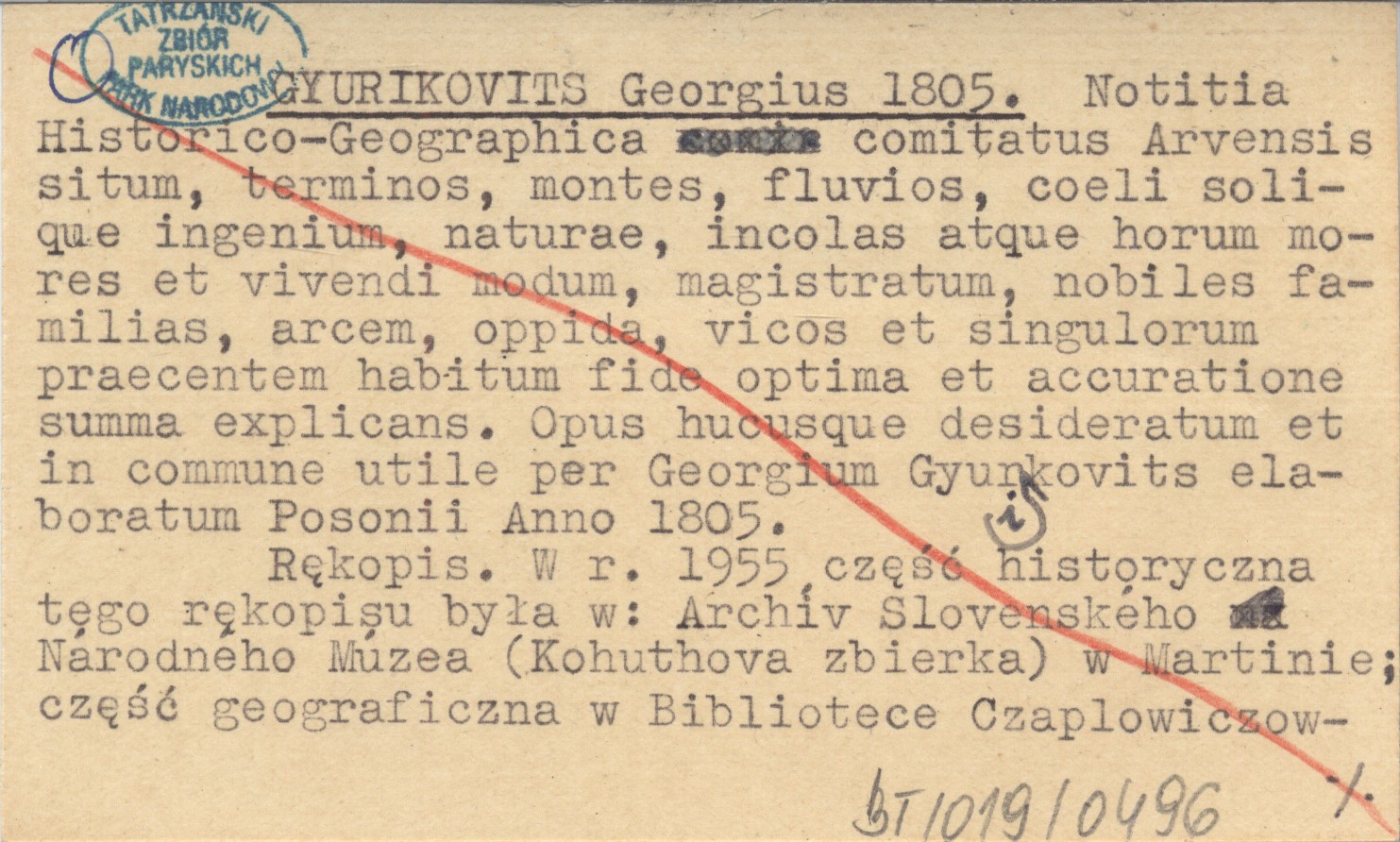 , Rękopis. W r. 1955 część historyczna tęgo rękopisu była w: Archív Slovenského Národného Múzea (Kohuthova zbierka) w Martinie; część geograficzna w Bibliotece Czaplowiczowskiej (Čaplovičova knihovnia) w Dolnym Kubinie. Wg FÜGEDI E. 1947 (S. 183): rps tej pracy znajduje się w Węgierskim Muzeum Narodowym w Budapeszcie.