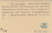 -h. -l. 1936 Kulturelle Aufgaben Deutschendorfs. Unterbringung der deutschen Bürgerschule. Errichtung eines slowakischen Gymnasiums. Mehr Mitarbeit am Karpathenmuseum!