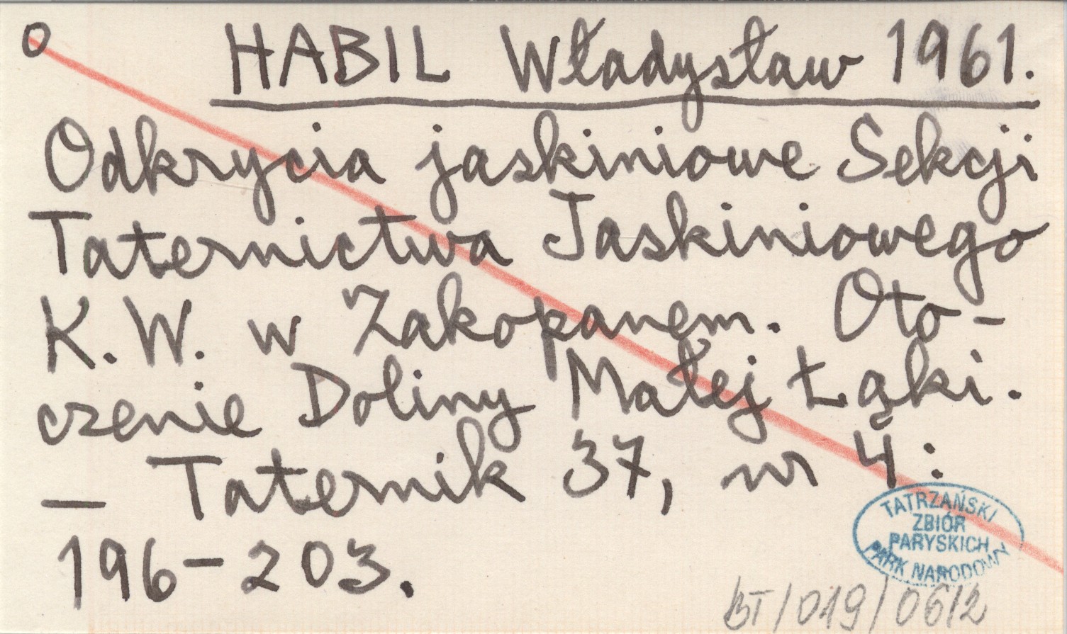 HABIL Władysław 1961 Odkrycia jaskiniowe Sekcji Taternictwa Jaskiniowego K.W. w Zakopanem. Otoczenie Doliny Małej Łąki.