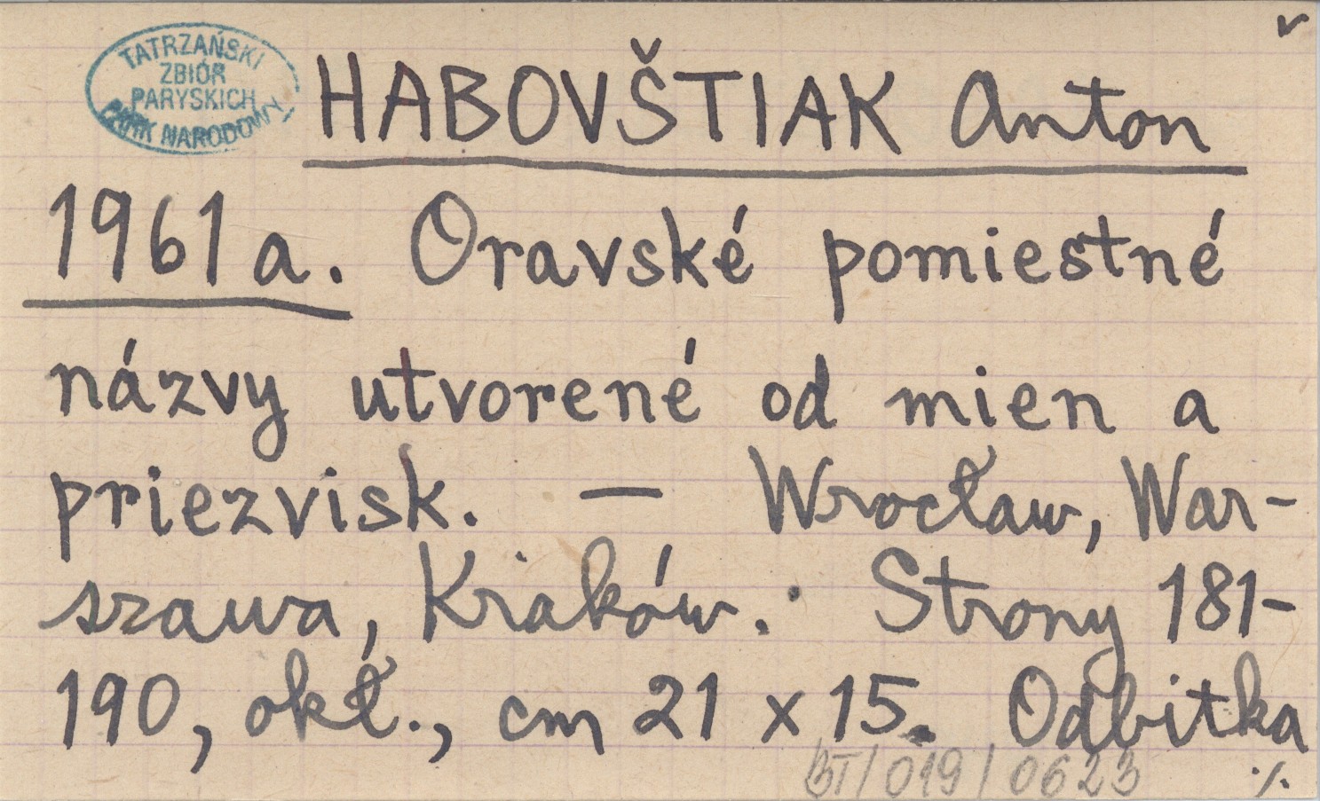 Wrocław, Warszawa, Kraków , S. 181-190, okł., 21x15 cm. Odbitka z: HABOVŠTIAK A. 1961.