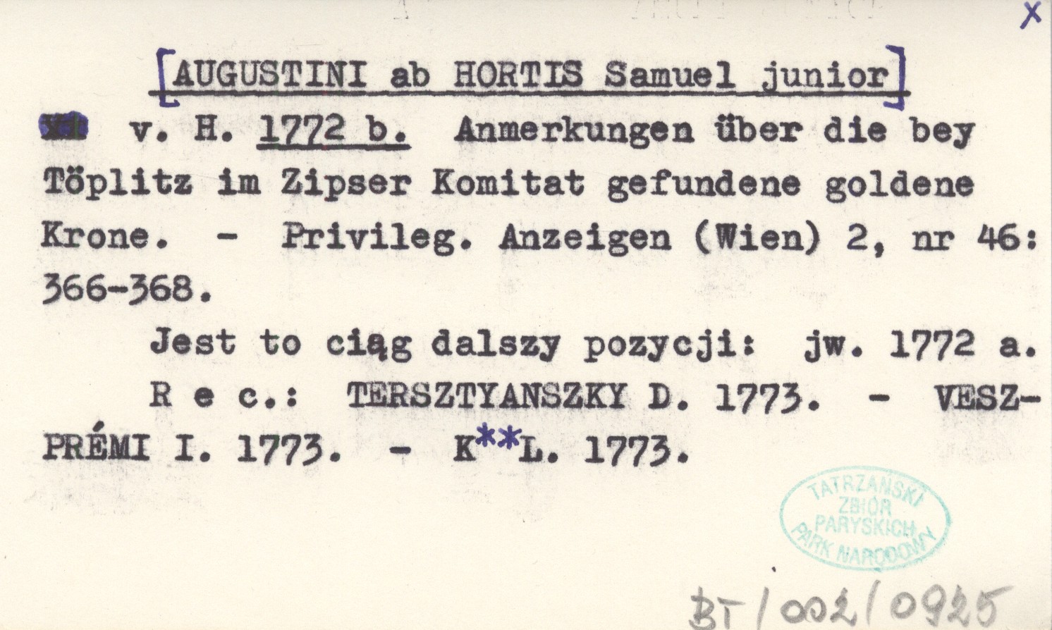 Provoleg. Anzeigen (Wien) , 2, nr 46: 366-368. Jest to ciąg dalszy pozycji: jw. 1772 a REC: TERSZTYANSZKY D. 1773.- VESZPRÉMI I. 1773.- K**L. 1773.