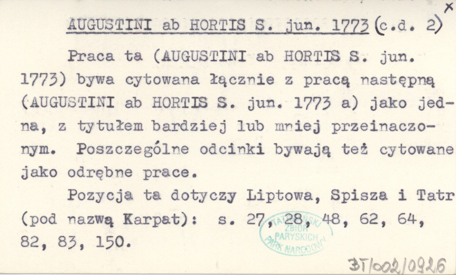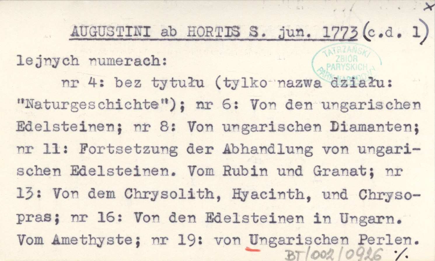 Privilegirte Anzeigen (Wien) , 3, nr 4: 27-30 ; nr 6: 46-48 ; nr 8: 62-64 ; nr 11: 81-85 ; nr 13: 99-103 ; nr 16: 125-126 ; nr 19: 149-151. Pozycja ta dotyczy Liptowa, Spisza i Tatr (pod nazwą Karpat): 27, 28, 48, 62, 64, 82, 83, 150 s. Kolejne odcinki są podpisane: S. ab H., v. H., ab H., v. H., V. H., ab H., ab H. Wszystkie odcinki wydrukowano w dziale "Naturgeschichte", a mają następujące tytuły w kolejnych numerach: nr 4: bez tytułu (tylko nazwa działu: "Naturgeschichte") ; nr 6: Von den ungarischen Edelsteinen ; nr 8: Von ungarischen Diamanten ; nr 11: Forstsetzung der Abhandlung von ungarischen Edelsteinen. Vom Rubin und Granat ; nr 13: Von dem Chrysolith, Hyacinth, und Chrysopras ; nr 16: Von den Edelsteinen in Ungarn. Vom Amethyste ; nr 19: von Ungsrischen Perlen. Praca ta (AUGUSTINI ab HORTIS S. jun. 1773) bywa cytowana łącznie z pracą następną (AUGUSTINI ab HORTIS S. jun. 1773 a) jako jedna, z tytułem bardziej lub mniej przeinaczonym. Poszczególne odcinki bywają też cytowane jako odrębne prace.