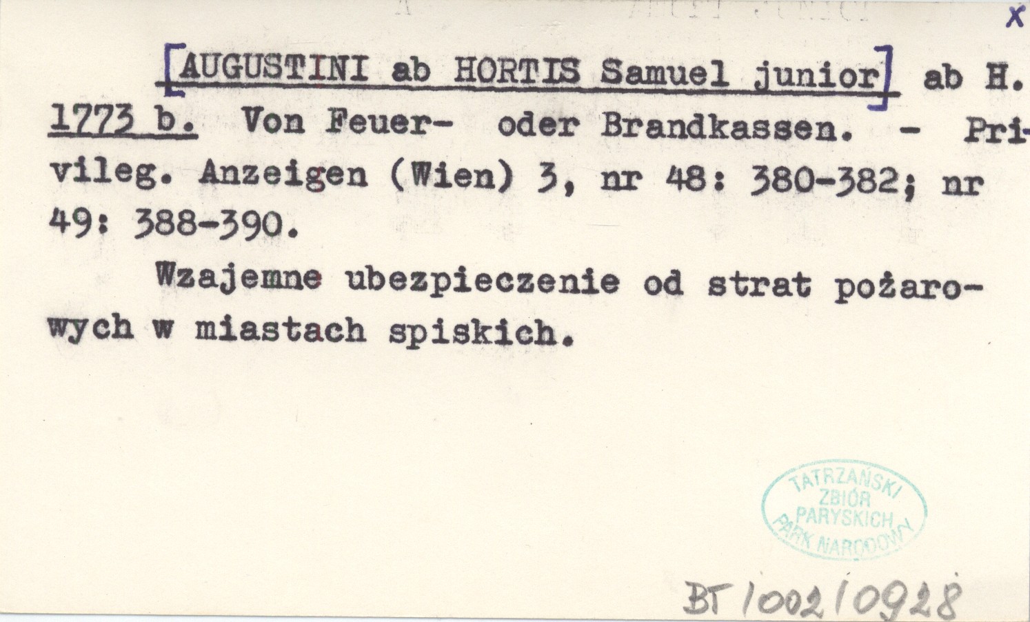 Privileg. Anzeigen (Wien) , 3, nr 48: 380-382 ; nr 49: 388-390. Wzajemne ubezpieczenie od strat pożarowych w miastach spiskich.