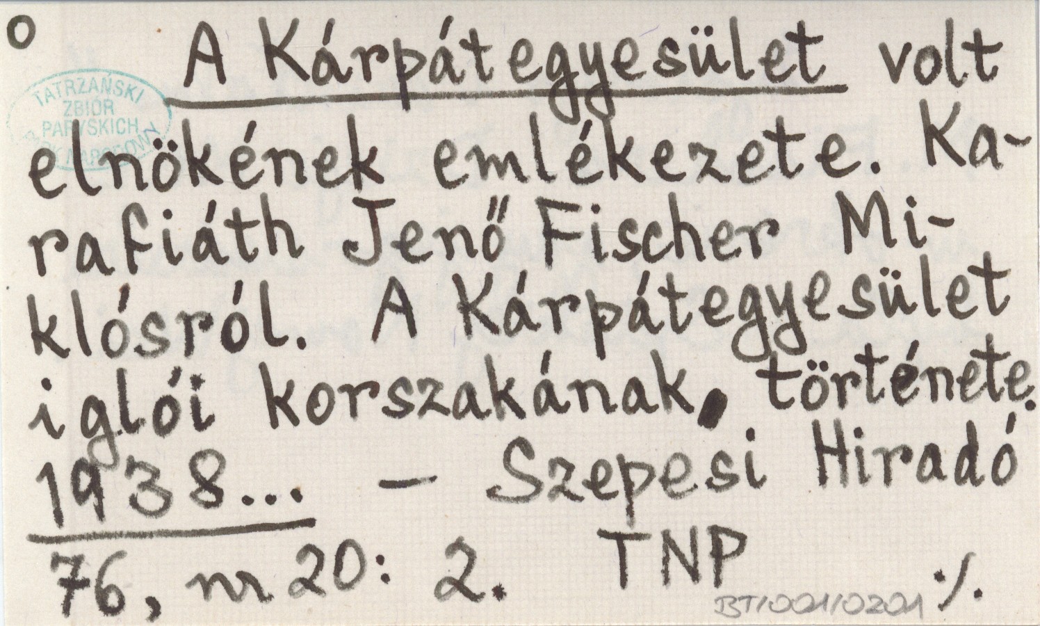 A Kárpátegyesület volt elnökének emlékezete. Karafiáth Jenö Fischer Miklósról. A Kárpátegyesület iglói korszakának története. 1938...