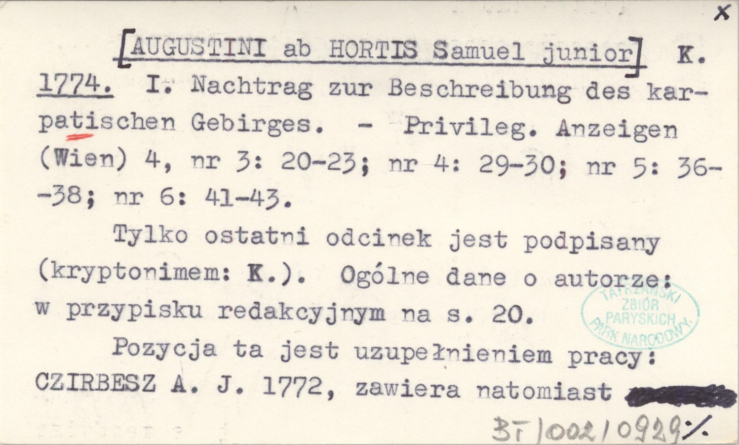 Privileg. Anzeigen (Wien) , 4, nr 3: 20-23 ; nr 4: 29-30 ; nr 5: 36-38 ; nr 6: 41-43. Tylko ostatni odcinek jest podpisany (kryptonimem: K.). Ogólne dane o autorze: w przypisku redakcyjnym na 20 s. Pozycja ta jest uzupełnieniem pracy: CZIRBESZ A. J. 1772, zawiera natomiast pozycję: BUCHHOLTZ G. sen. 1774.