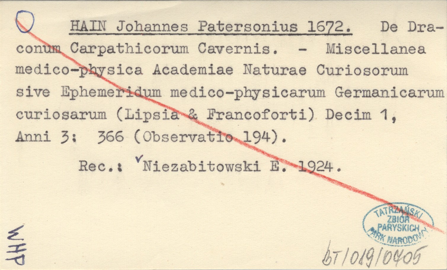HAIN Johannes Patersonius 1672 De Draconum Carpathicorum Cavernis.