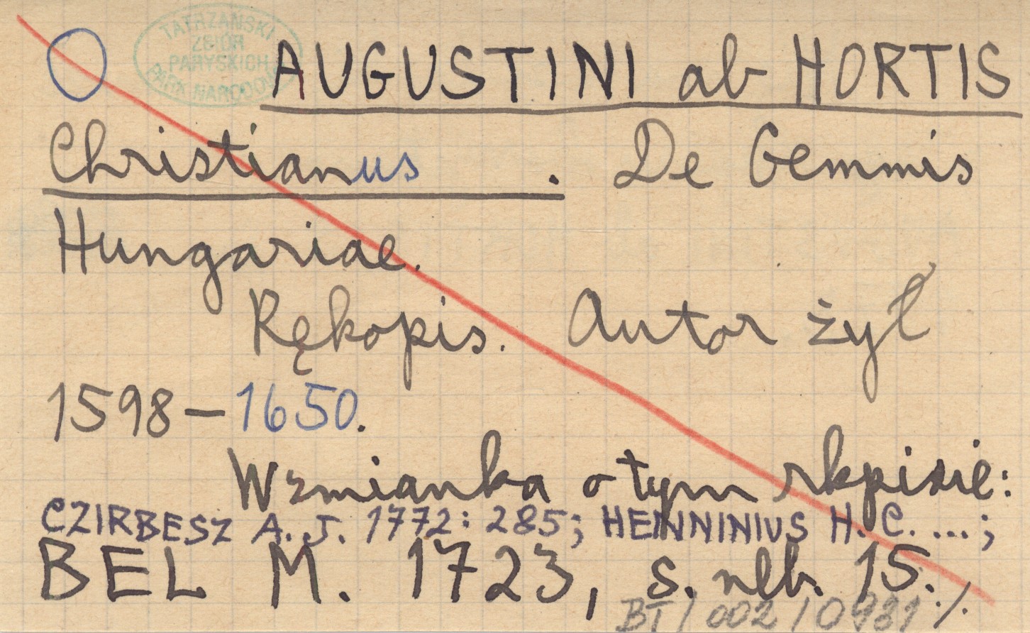 , Rękopis. Autor żył 1598-1650. Wzmianka o tym rkpisie: CZIRBESZ A. J. 1772: 285 ; HENNINIUS H. C. ... ; BEL M. 1723: [15]. Nie ma wzmianki, ale może z tego rkpisu skorzystano w: AUGUSTINI ab HORTIS S. jun. 1773.