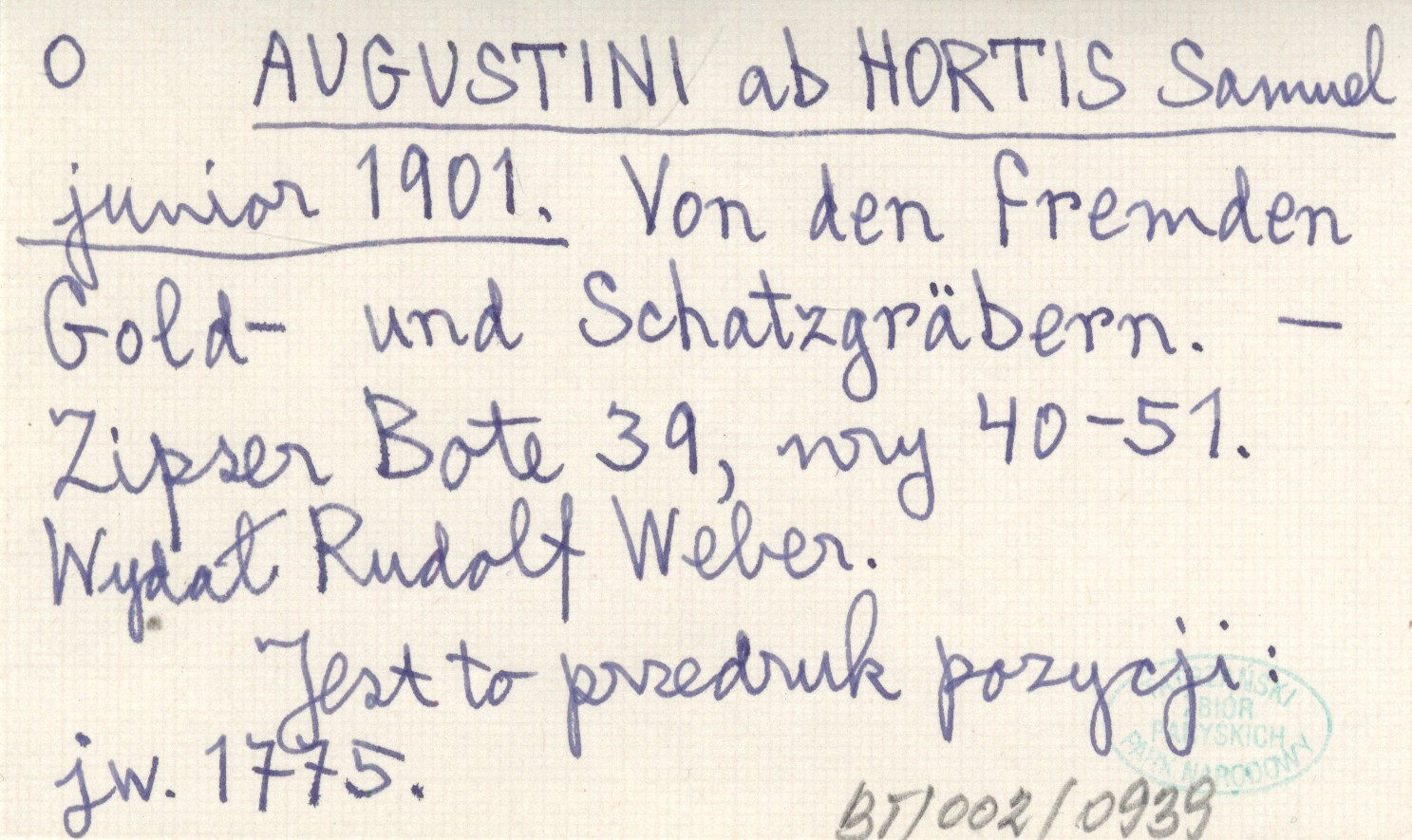 AUGUSTINI ab HORTIS Samuel junior 1901 Von den fremden Gold- und Schatzgräbern.