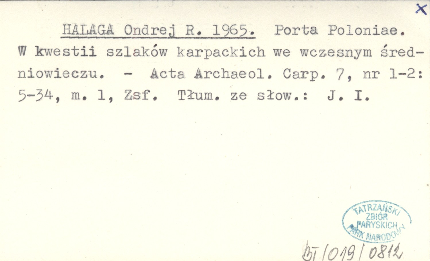 HALAGA Ondrej R. 1965 Porta Poloniae. W kwestii szlaków karpackich we wczesnym średniowieczu.