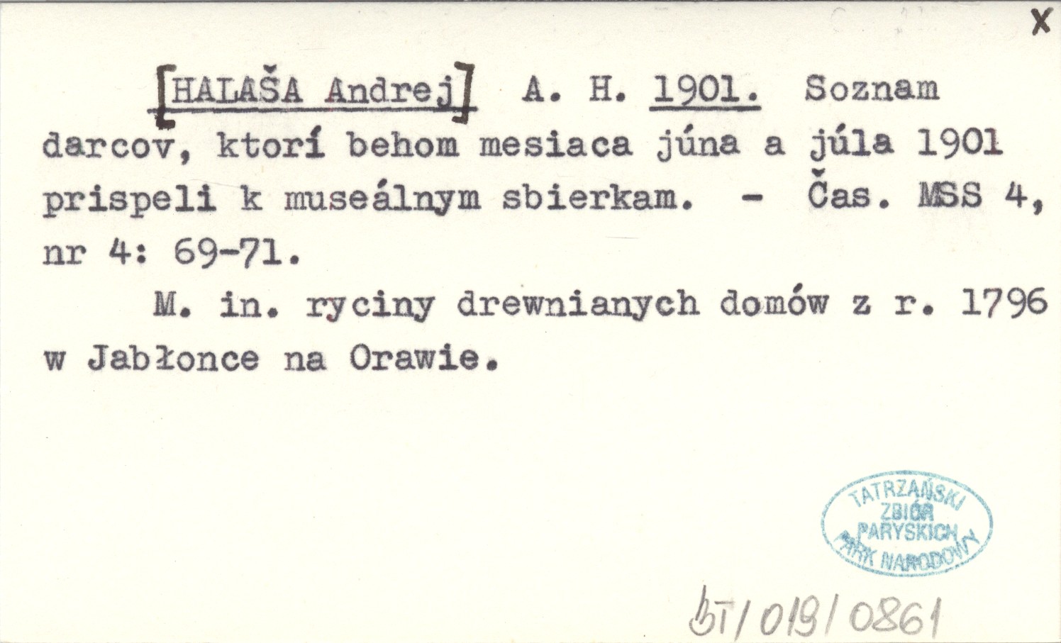 A. H. [HALAŠA Andrej] 1901 Soznam darcov, ktorí behom mesiaca júna a júla 1901 prispeli k museálnym sbierkam.