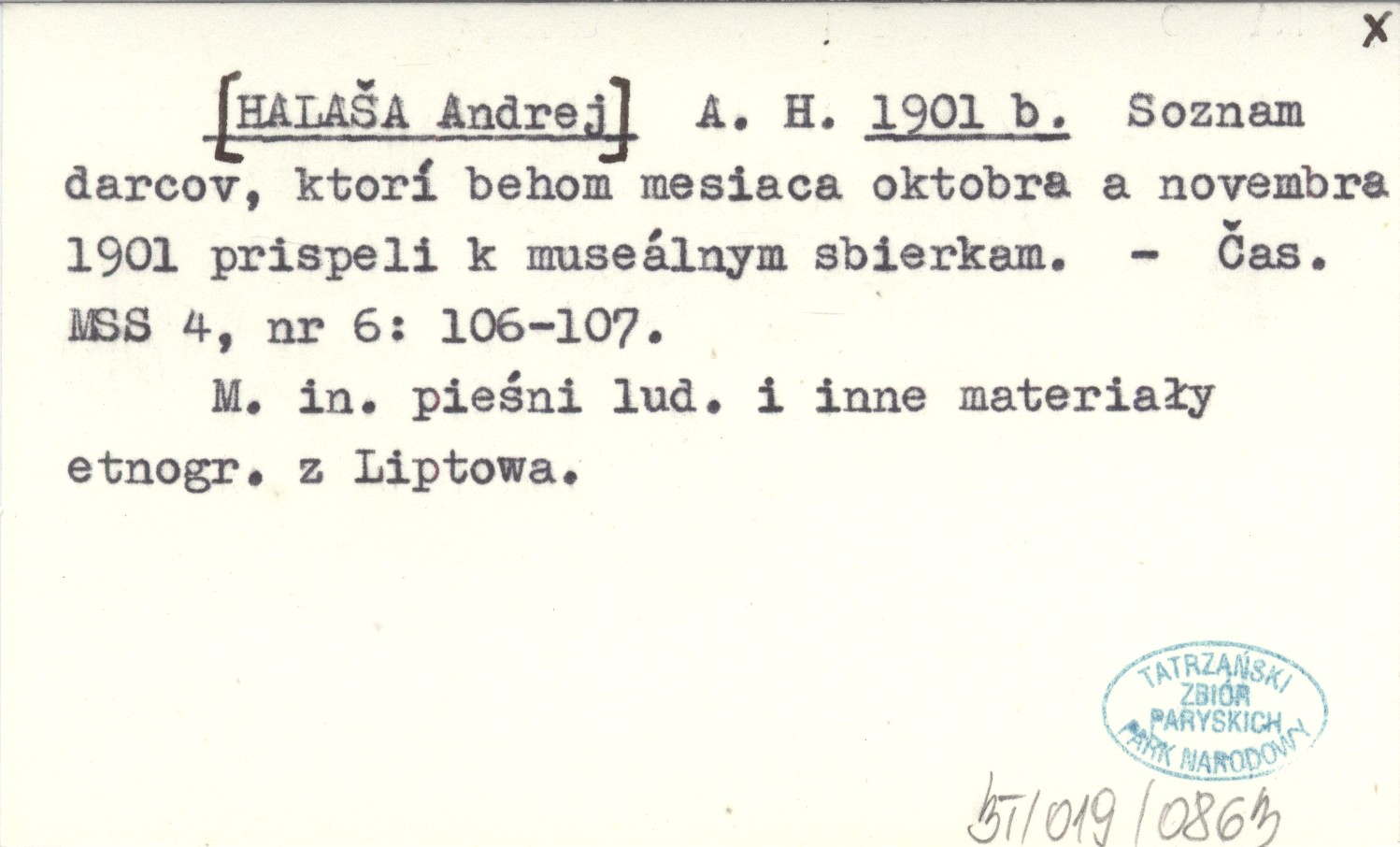 A. H. [HALAŠA Andrej] 1901 b Soznam darcov, ktorí behom mesiaca oktobra a novembra 1901 prispeli k museálnym sbierkam.