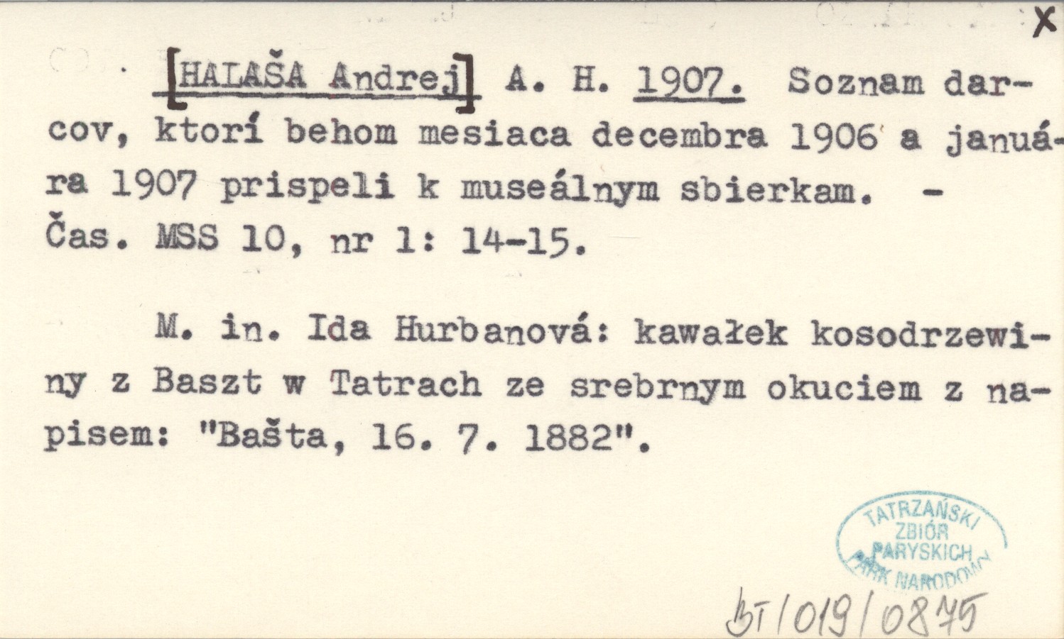 Čas. MSS, 10, nr 1: 14-15. M. in. Ida Hurbanová: kawałek kosodrzewiny z Baszt w Tatrach ze srebrnym okuciem z napisem: "Bašta, 16. 7. 1882".