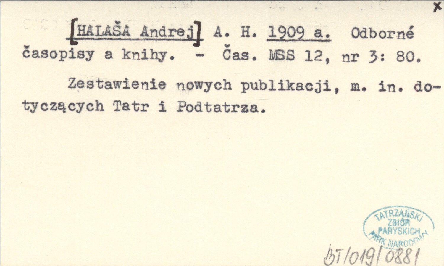 A. H. [HALAŠA Andrej] 1909 a Odborné časopisy a knihy.