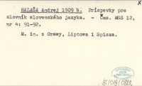 HALAŠA Andrej 1909 b Príspevky pre slovník slovenského jazyka.
