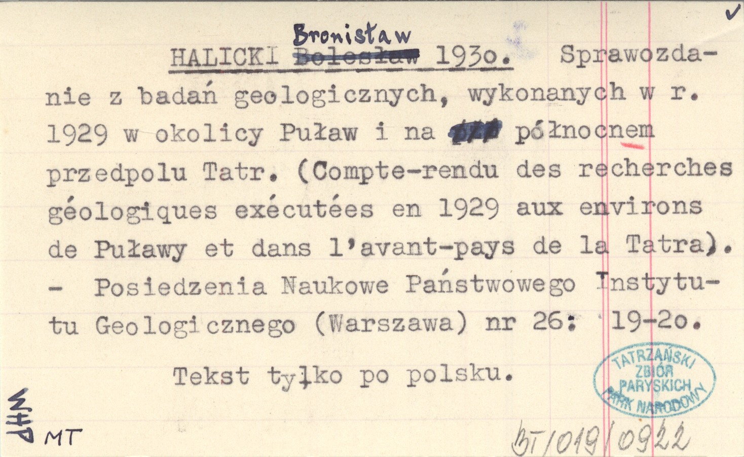 HALICKI Bronisław 1930 Sprawozdanie z badań geologicznych, wykonanych w r. 1929 w okolicy Puław i na północnem przedpolu Tatr. (Compte-rendu des recherches géologiques exécutées en 1929 aux environs de Puławy et dans l'avant-pays de la Tatra).