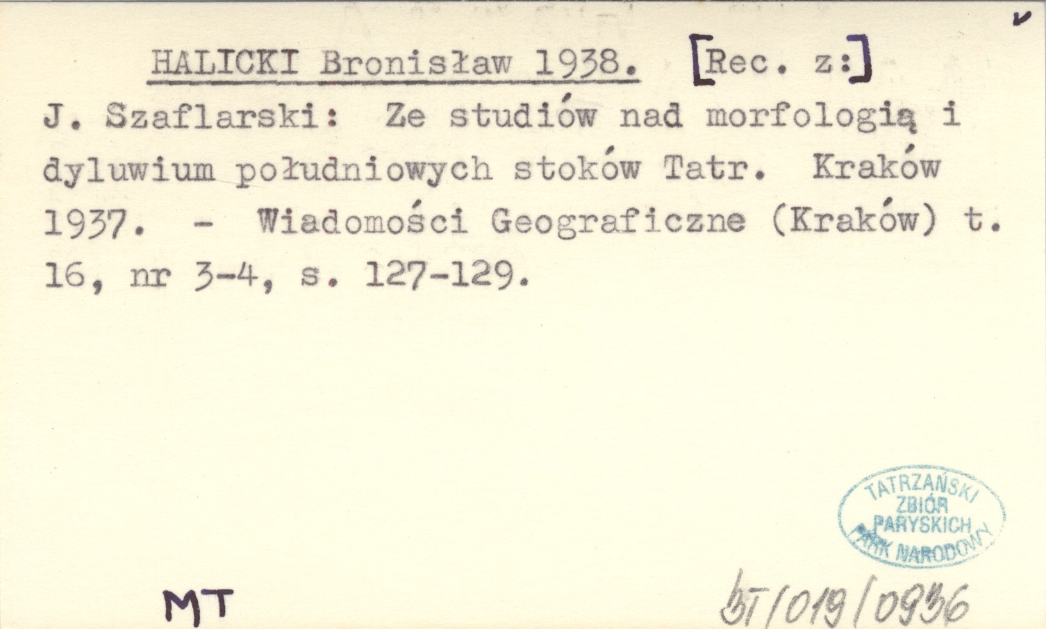 HALICKI Bronisław 1938 [Rec. z:] J. Szaflarski: Ze studiów nad morfologią i dyluwium południowych stoków Tatr. Kraków 1937.