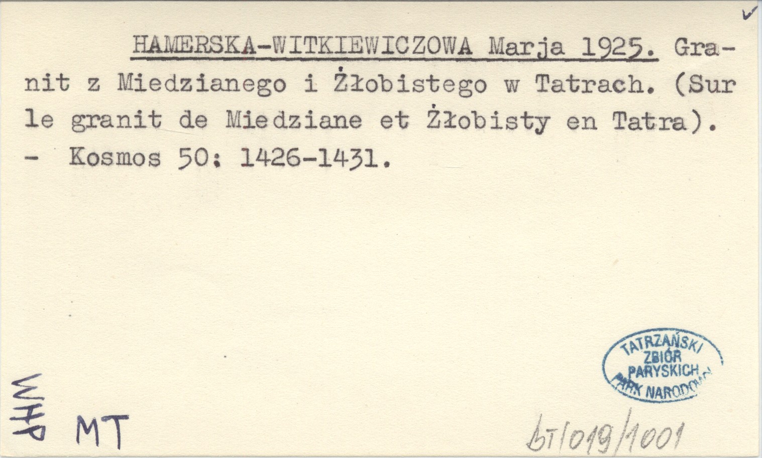 HAMERSKA-WITKIEWICZOWA Marja 1925 Granit z Miedzianego i Żłobistego w Tatrach. (Sur le granit de Miedziane et Żłobisty en Tatra).