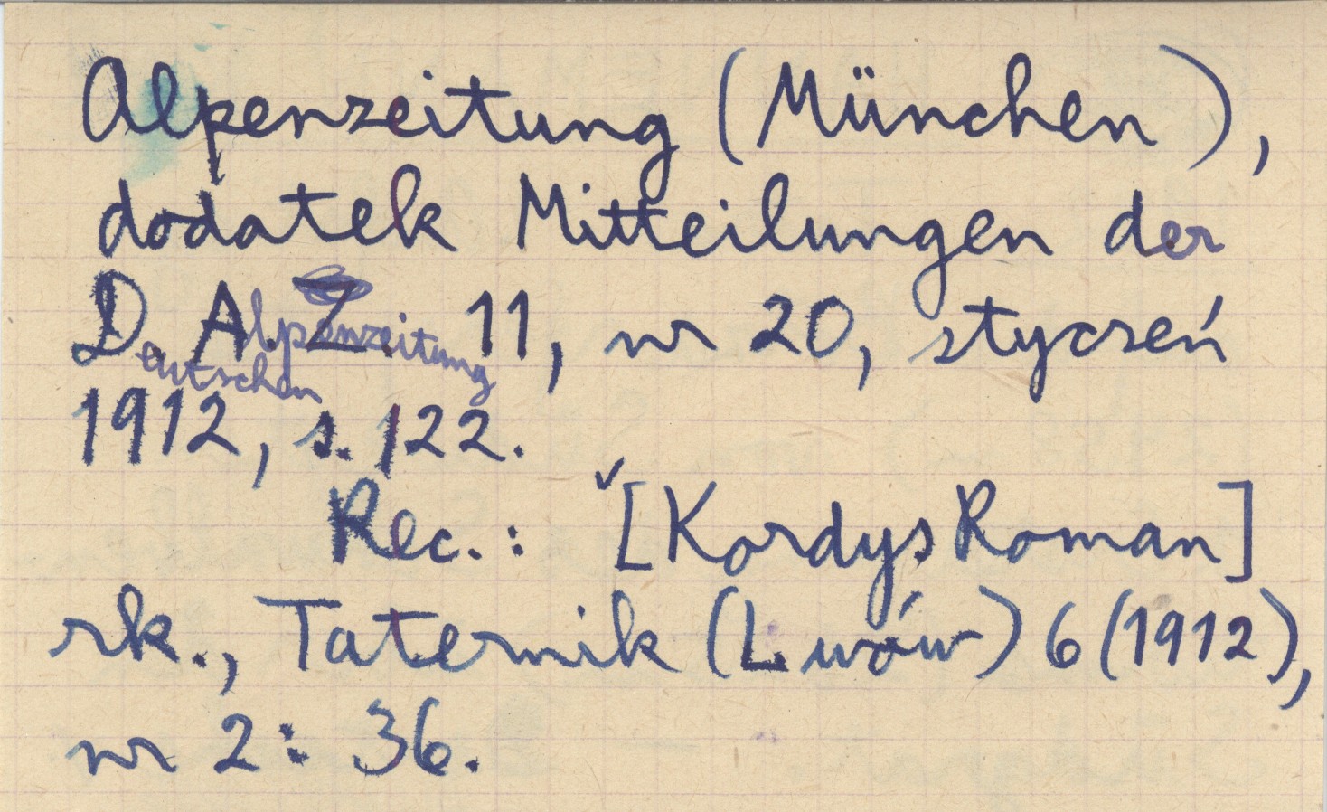 Deutche Alpenzeitung, dod. Mitteilungen der Deutschen Alpenzeitung (München) , 11, nr 20, 01.1912, S. 122. REC: [Kordys Roman] rk., Taternik (Lwów) 6 (1912), nr 2: 36.