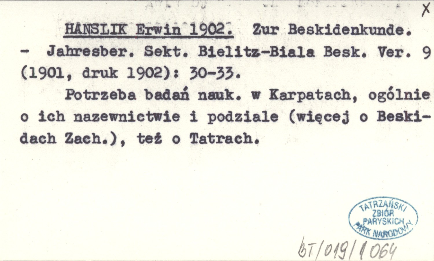 Jahresbericht der Sektion Bielitz-Biala des Beskiden-Vereines, 9 (1901, druk 1902): 30-33. Potrzeba badań naukowych w Karpatach, ogólnie o ich nazewnictwie i podziale (więcej o Beskidach Zachodnich), też o Tatrach.