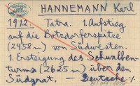HANNEMANN Karl 1912 Tatra. 1. Aufstieg aud fie Botzdorferspitze (2458 m) von Südwestern. 1. Ersteigung des Schwalbenturns (2625 m) über den Südgrat.
