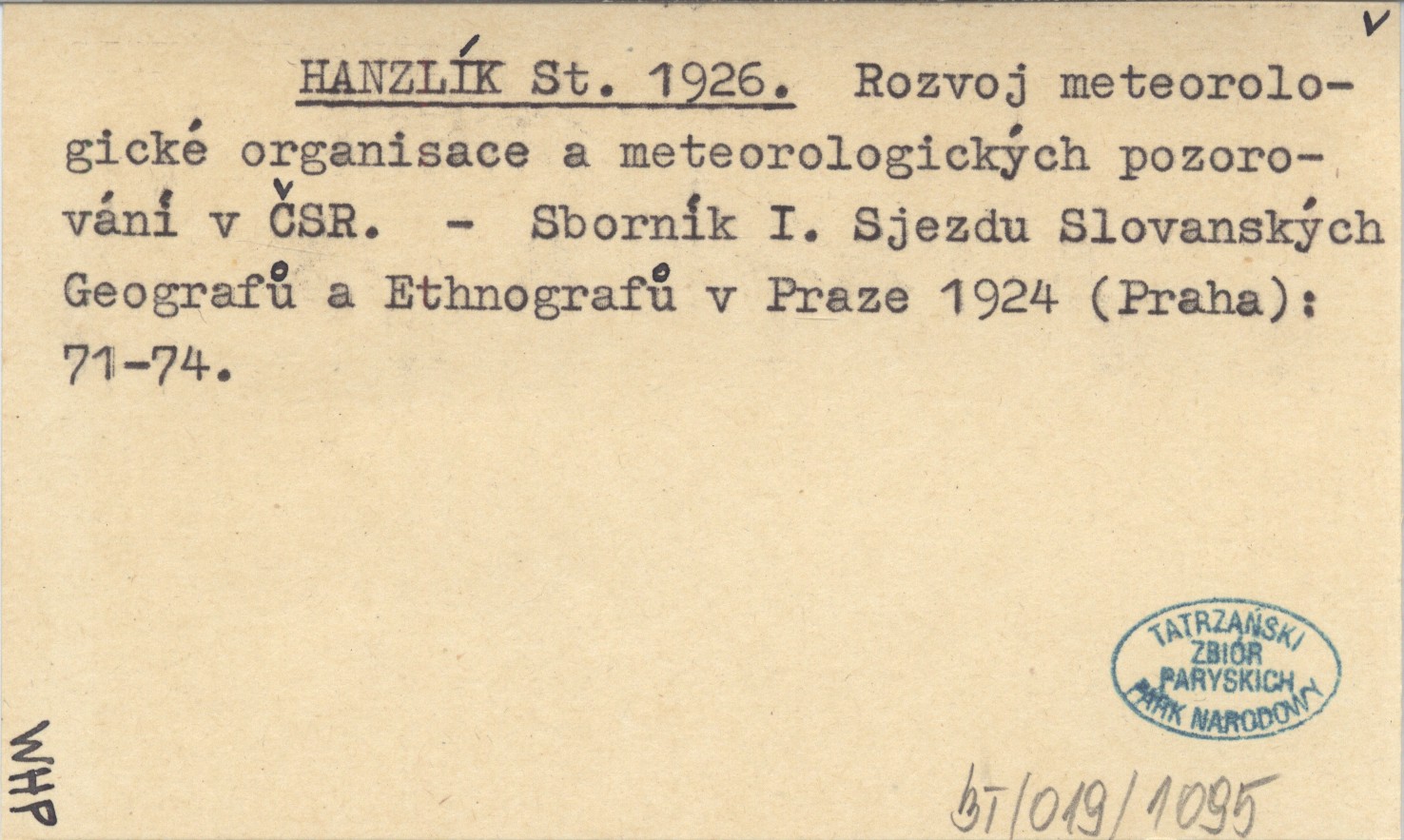HANZLÍK St. 1926 Rozvoj meteorologické organisace a meteorologickęch pozorování v ÈSR.