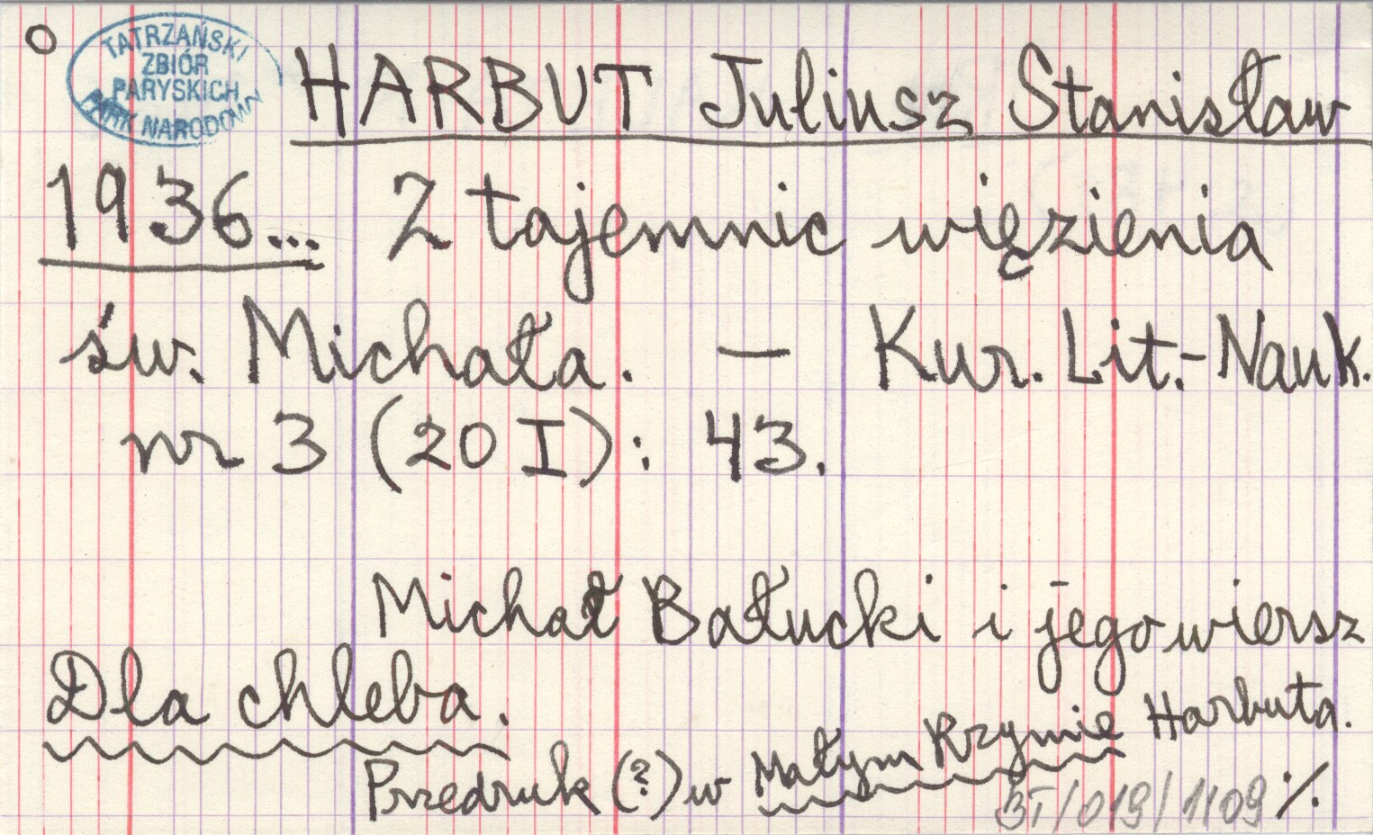 Kuryer Literacko-Naukowy, Nr 3 (20 I): 43. Michał Bałucki i jego wiersz "Dla chleba". Przedruk (?) w "Małym Rzymie" Harbuta. REC: KALETA R. *1986 (S. 481).