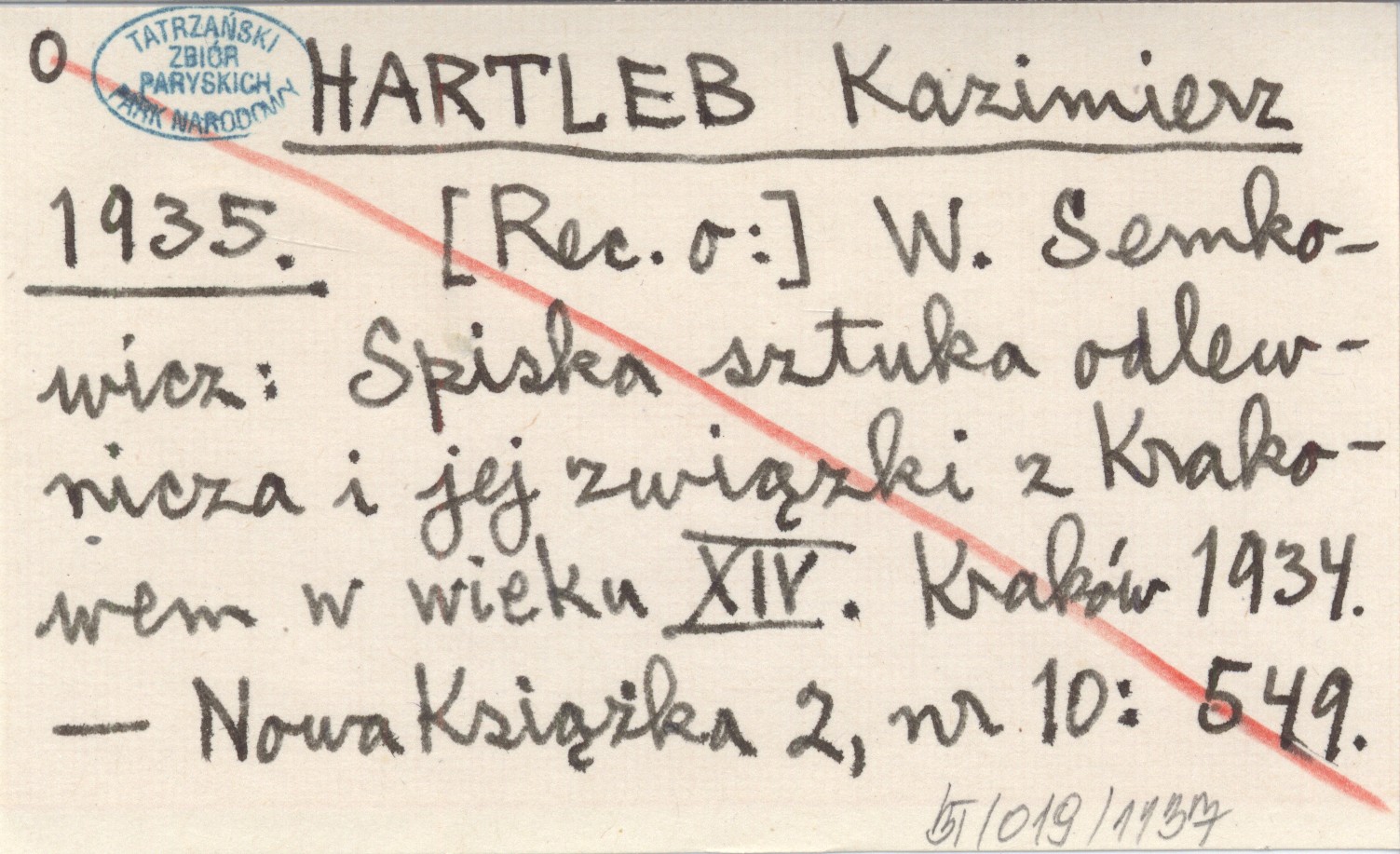 HARTLEB Kazimierz 1935 [Rec. o:] W. Semkowicz: Spiska sztuka odlewnicza i jej związki z Krakowem w wieku XIV. Kraków 1934.