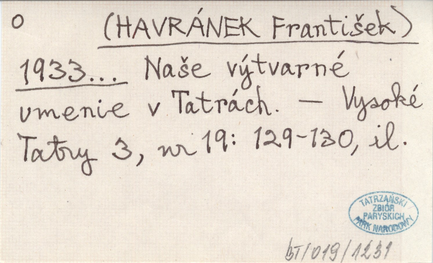 (HAVRÁNEK František) 1933... Naše výtvarné umenie v Tatrách.
