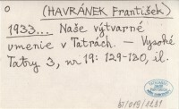 (HAVRÁNEK František) 1933... Naše výtvarné umenie v Tatrách.