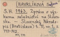 S. H. [HAVRLÍKOVÁ Svatava] 1963 Zpráva o výzkumu salašnictví na Slovensku.