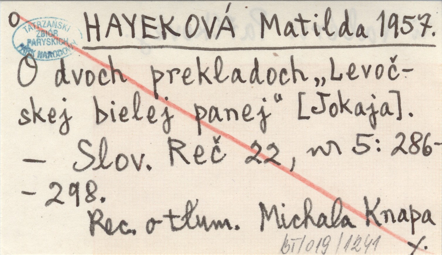 HAYEKOVÁ Matilda 1957 O dvoch prekladoch "Levočskej bielej panej" [Jokaja].