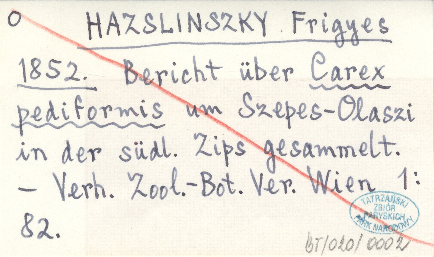 HAZSLINSZKY Frigyes 1852 Bericht über Carex pediformis um Szepes-Olaszi in der südl. Zips gesammelt.