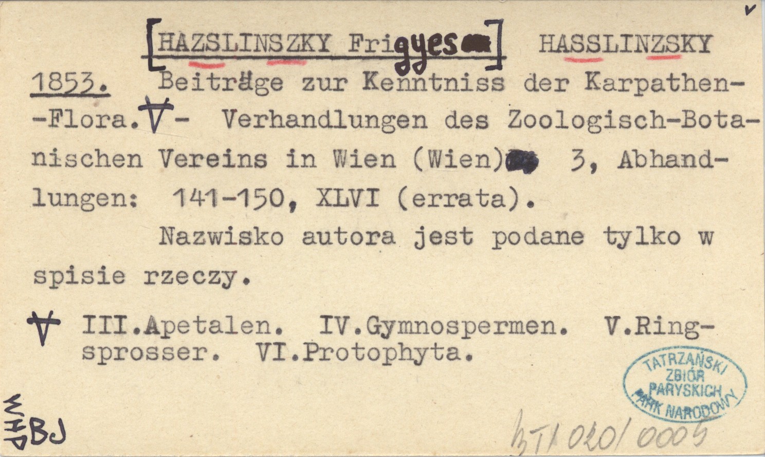 HASSLINZSKY [HAZSLINSZKY Frigyes] 1853 Beiträge zur Kenntniss der Karpathen-Flora. III. Apetalen. IV. Gymnospermen. V. Ringsprosser. VI. Protophyta.