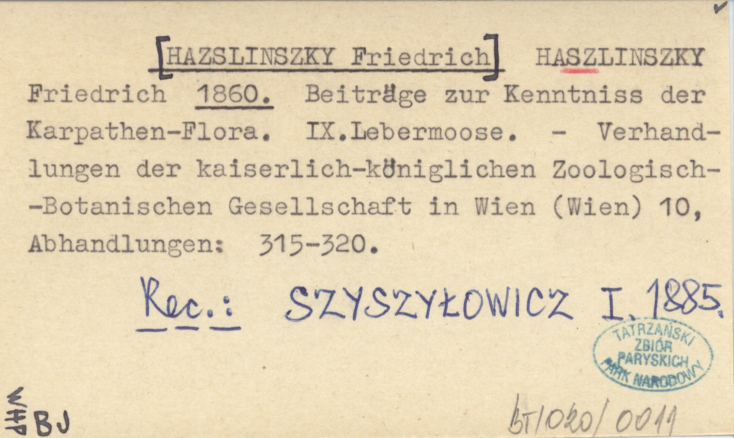 HASZLINSZKY Friedrich [HAZSLINSZKY Friedrich] 1860 Beiträge zur Kenntniss der Karpathen-Flora. IX. Lebermoose.