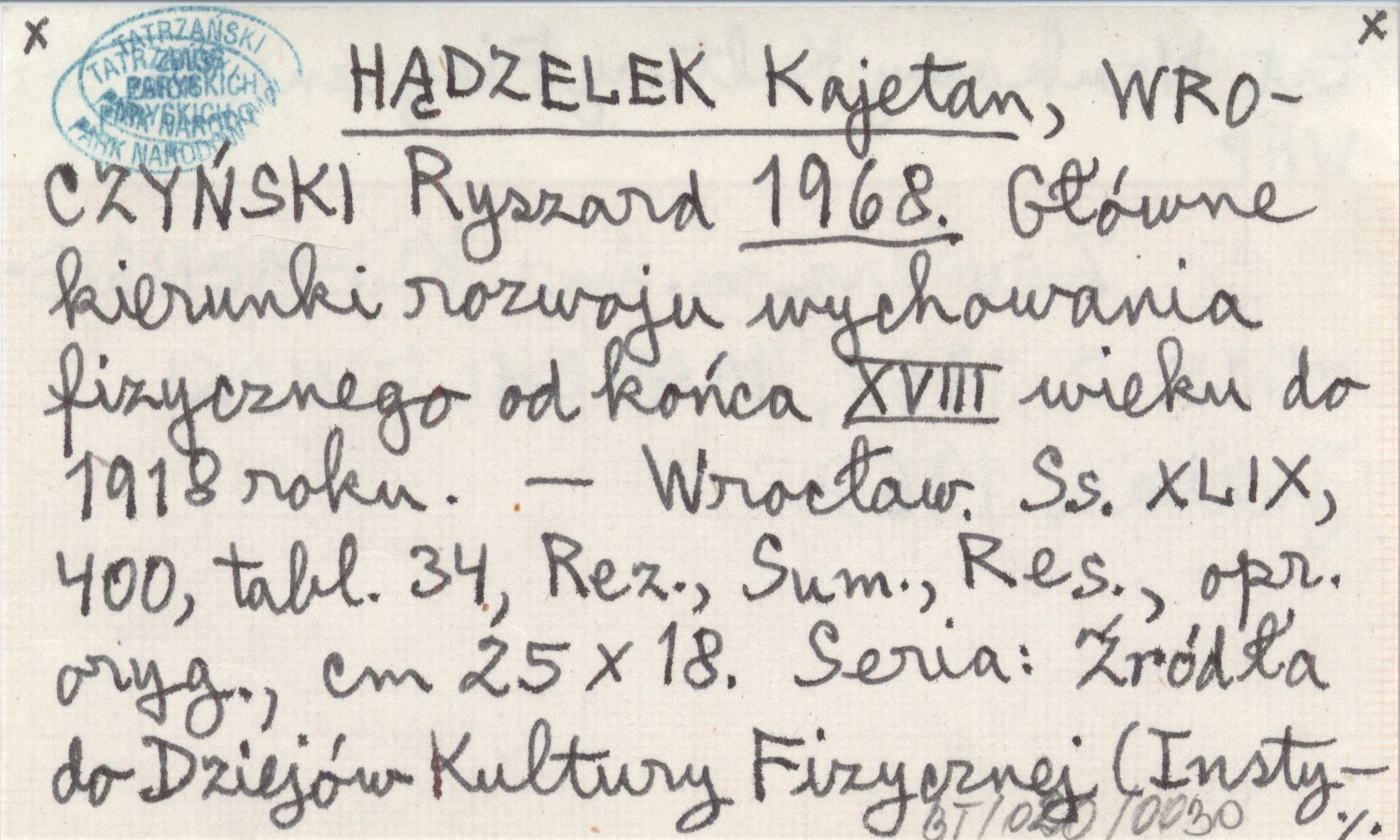 HĄDZELEK Kajetan WROCZYŃSKI, Ryszard. ; 1968 Główne kierunki rozwoju wychowania fizycznego od końca XVIII wieku do 1918 roku.