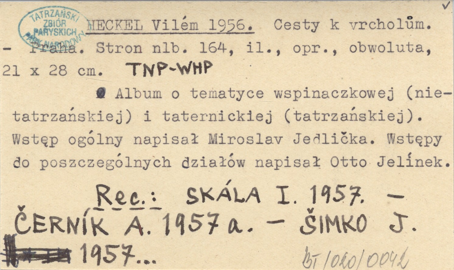 Praha , [164] s., il., opr., obw., 21x28 cm. Album o tematyce wspinaczkowej (nietatrzańskiej) i taternickiej (tatrzańskiej). Wstęp ogólny napisał Miroslav Jedlička. Wstępy do poszczególnych działów napisał Otto Jelínek REC: SKÁLA I. 1957. ČERNÍK A. 1957 a. ŠIMKO J. 1957...