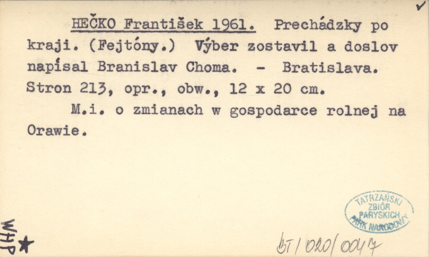HEČKO František 1961 Prechádzky po kraji. (Fejtóny). Výber zostavil a doslo napísal Branislav Choma.
