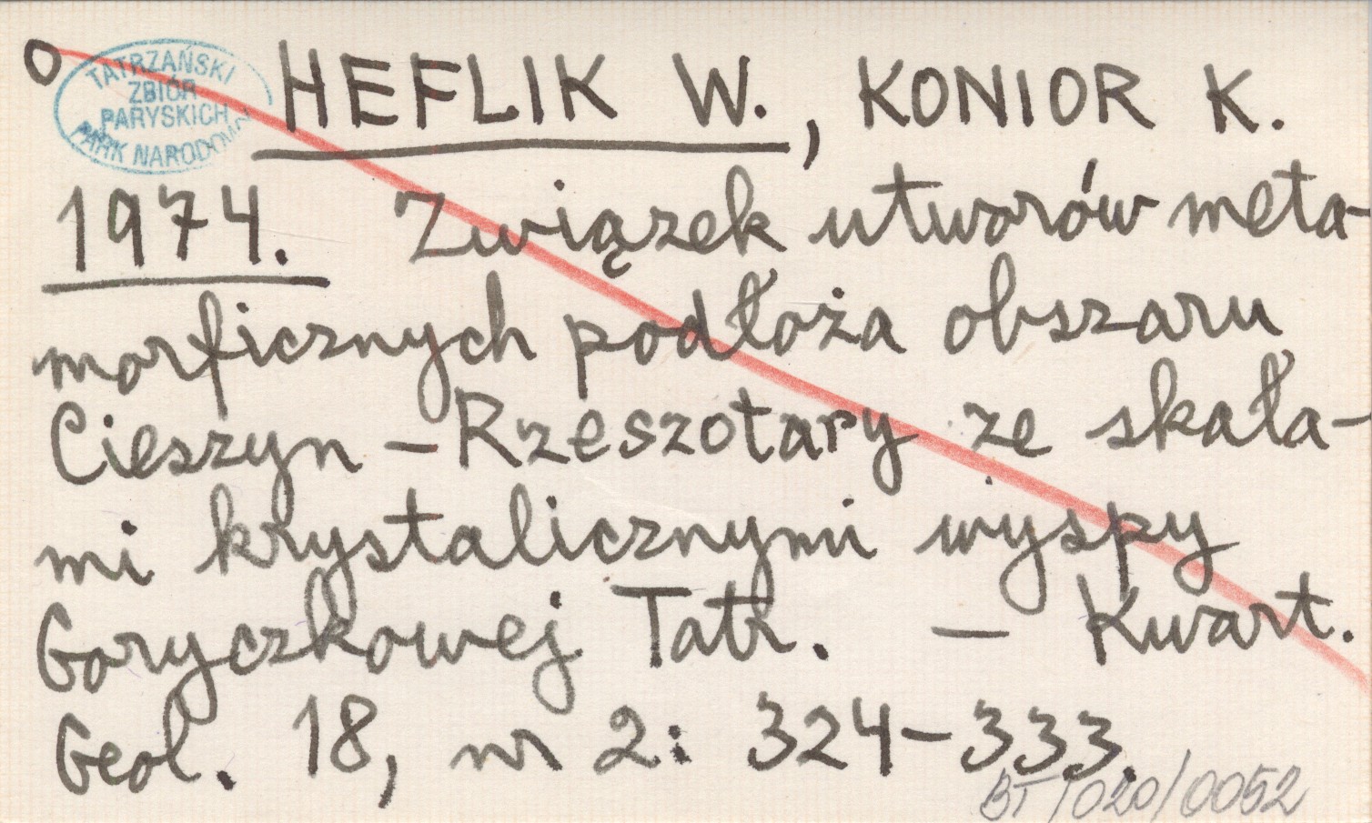 HEFLIK W. KONIOR, K. ; 1974 Związek utworów metaforycznych podłoża obszaru Cieszyn-Rzeszotary ze skałami krystalicznymi wyspy Goryczkowej Tatr.
