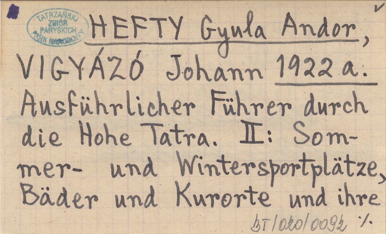 HEFTY Gyula Andor VIGYÁZÓ, Johann. ; 1922 a Ausführlicher Führer durch die Hohe Tatra. II: Sommer- und Wintersportplätze, Bäder und Kurorte und ihre Umgebung.