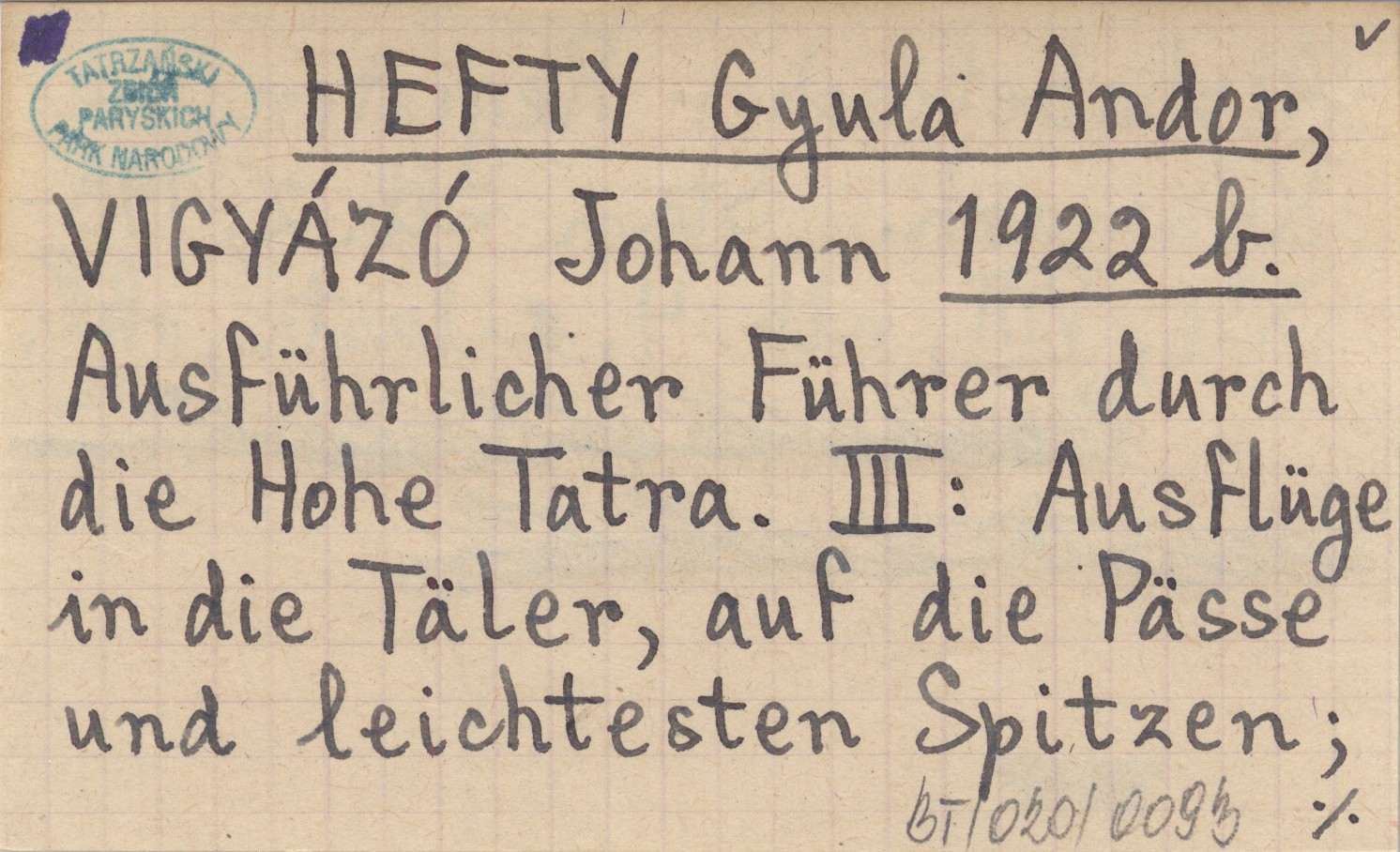 HEFTY Gyula Andor VIGYÁZÓ, Johann. ; 1922 b Ausführlicher Führer durch die Hohe Tatra. III: Ausflüge in die Täler, auf die Pässe und leichtesten Spitzen ; Alphabetischer Register.