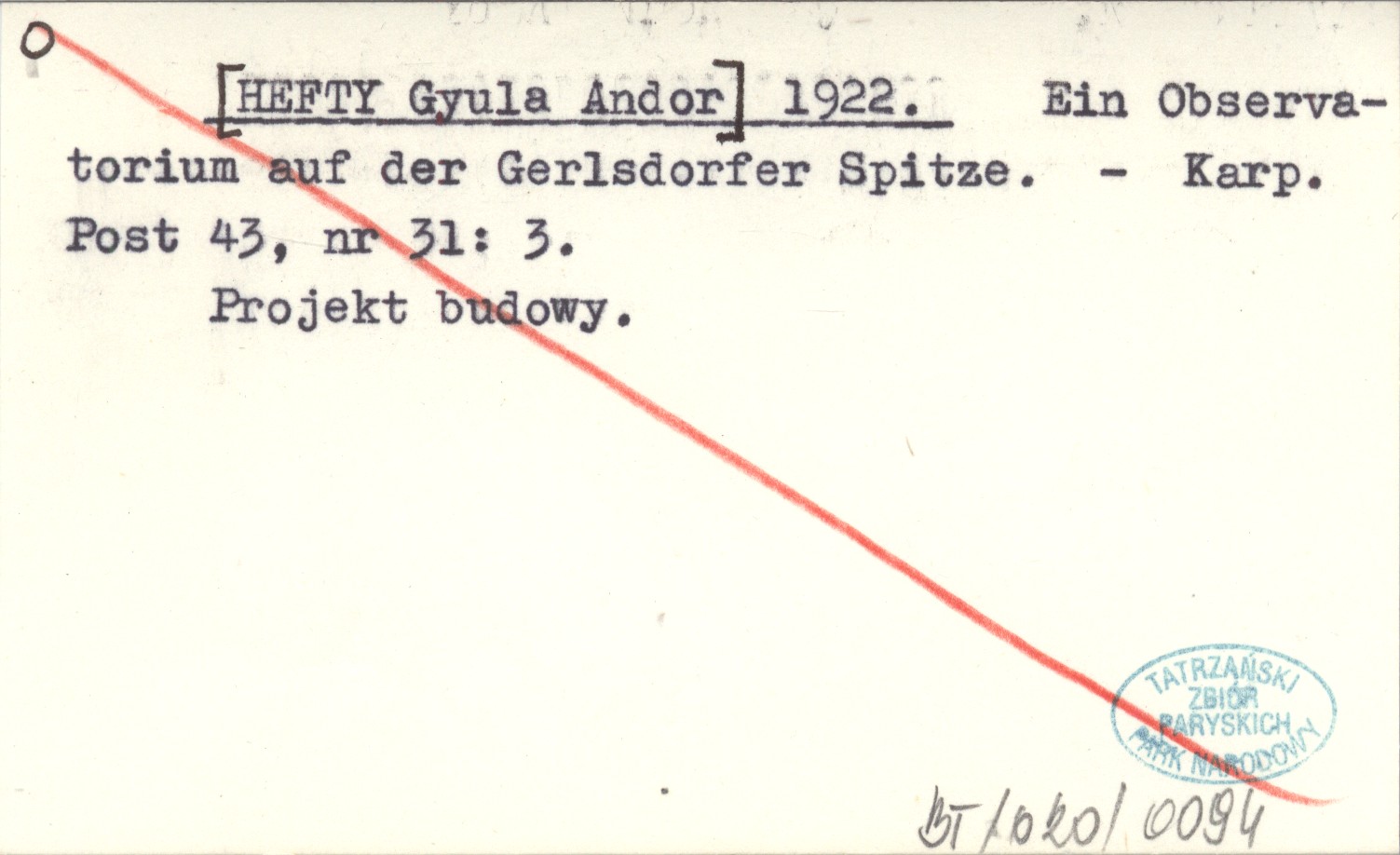 [HEFTY Gyula Andor] 1922 Ein Observatorium auf der Gerlsdorfer Spitze.