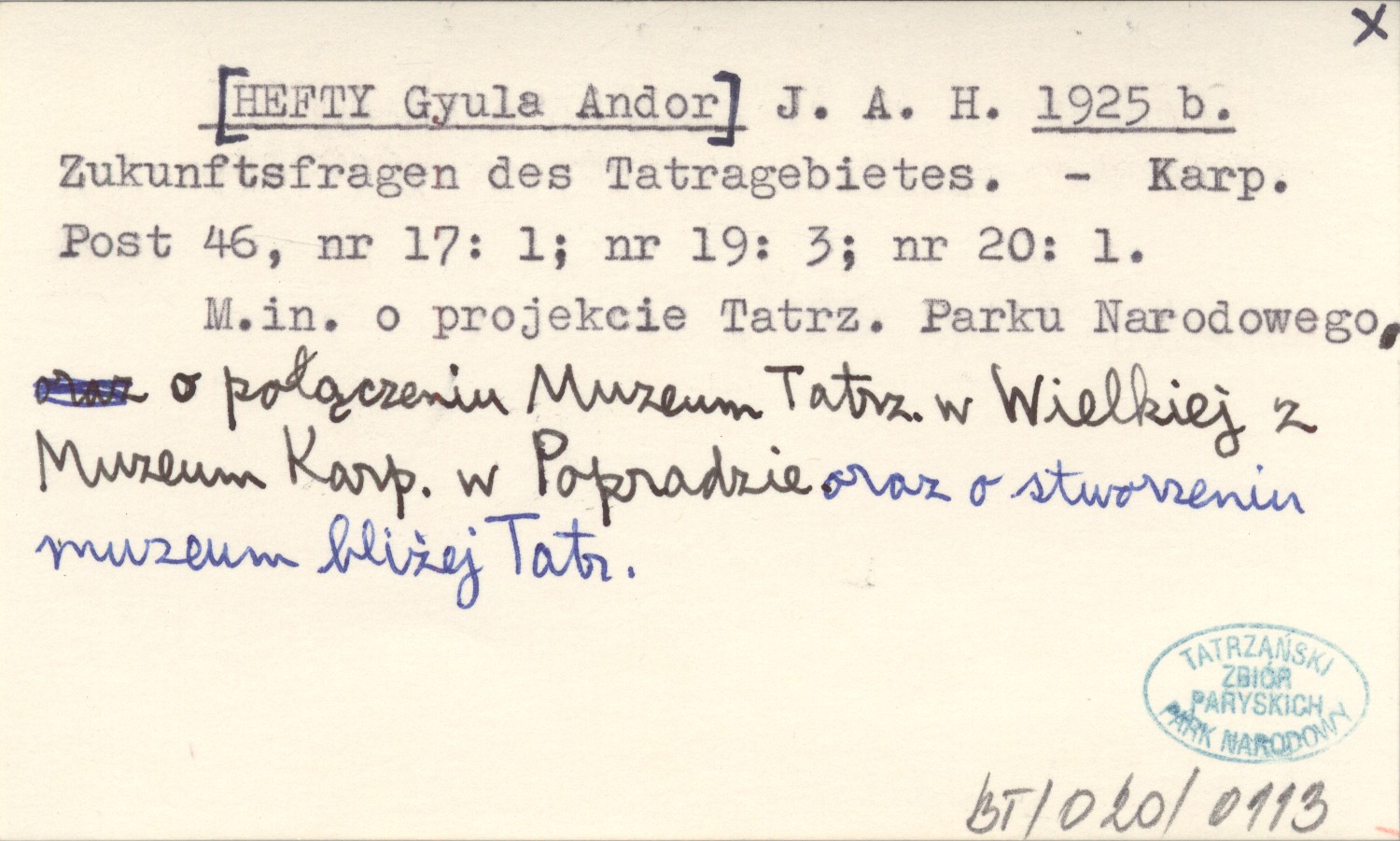 Karpathen-Post, 46, nr 17: 1; nr 19: 3; nr 20: 1. M. in. o projekcie Tatrzańskiego Parku Narodowego o połączeniu Muzeum Tatrzańskiego w Wielkiej z Muzeum Karpackim w Popradzie oraz o stworzeniu muzeum bliżej Tatr.